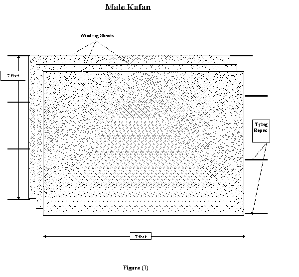 For the male, three pieces of white cotton is used. One is used to cover the private parts, the second is like an unsewn shirt with a slit at the top for the head and slits for the arms, and this piece covers the body from the neck to the below knees. The third is a large piece that covers slightly beyond the whole body from the head to the toes, and can be tied from above the head and below the feet. The larger sheets of cloth are the 2nd and 3rd pieces should be about 7 feet long and 7 feet wide. It is possible to have the larger sheets of cloth measuring up to 8 feet long and 8 feet wide.